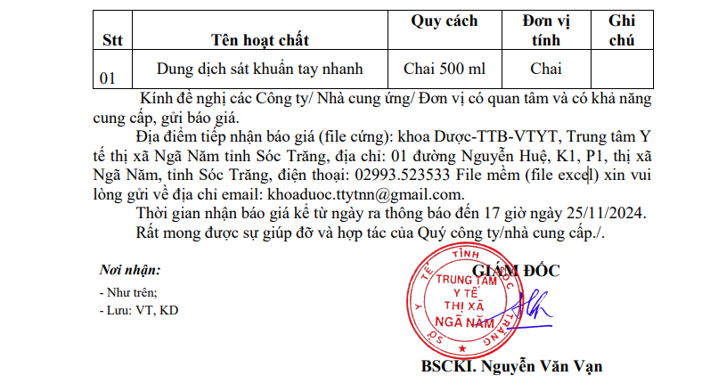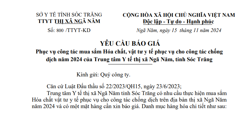 Trung tâm Y tế thị xã Ngã Năm Yêu cầu báo giá phục vụ công tác mua sắm Hóa chất, vật tư y tế phục vụ cho công tác chống dịch năm 2024 của Trung tâm Y tế thị xã Ngã Năm, tỉnh Sóc Trăng