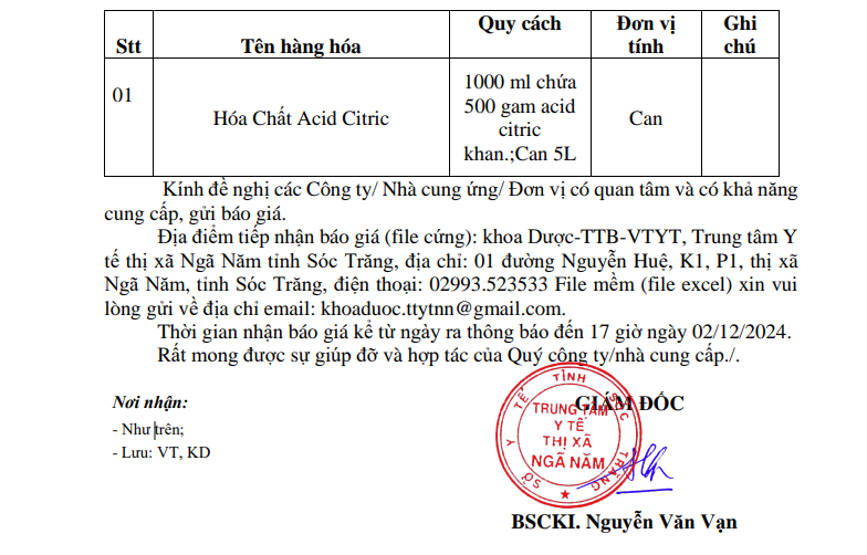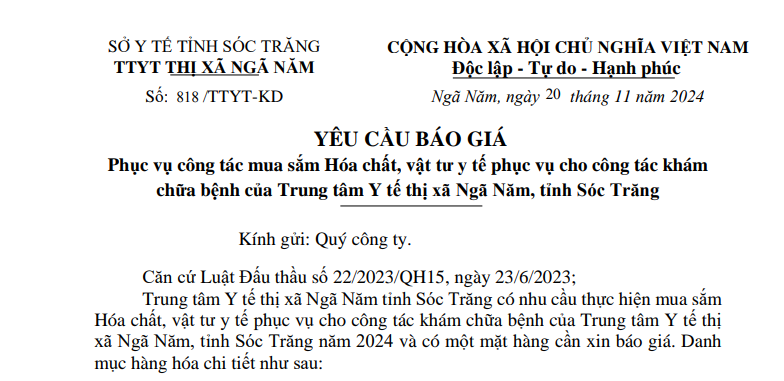 Trung tâm Y tế thị xã Ngã Năm Yêu cầu báo giá phục vụ công tác mua sắm Hóa chất, vật tư y tế phục vụ cho công tác khám chữa bệnh của Trung tâm Y tế thị xã Ngã Năm, tỉnh Sóc Trăng