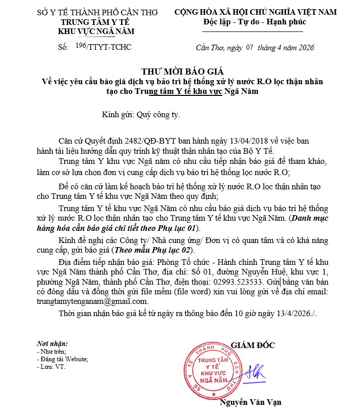 Về việc yêu cầu báo giá dịch vụ bảo trì hệ thống xử lý nước R.O lọc thận nhân tạo cho Trung tâm Y tế khu vực Ngã Năm