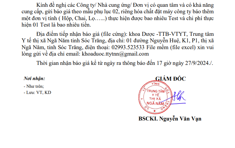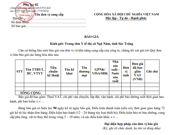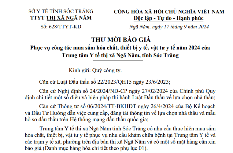 Trung tâm Y tế thị xã Ngã Năm mời báo giá phục vụ công tác mua sắm hóa chất, thiết bị y tế, vật tư y tế năm 2024 của Trung tâm Y tế thị xã Ngã Năm, tỉnh Sóc Trăng