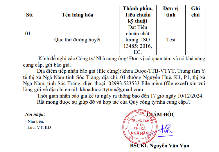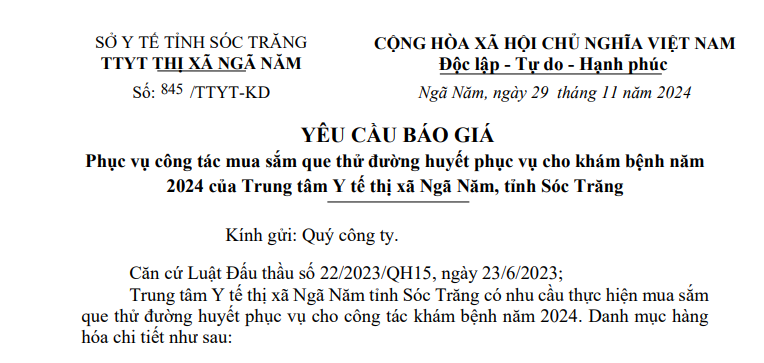 Trung tâm Y tế Yêu cầu báo giá phục vụ công tác mua sắm que thử đường huyết phục vụ cho khám bệnh năm 2024 của Trung tâm Y tế thị xã Ngã Năm, tỉnh Sóc Trăng