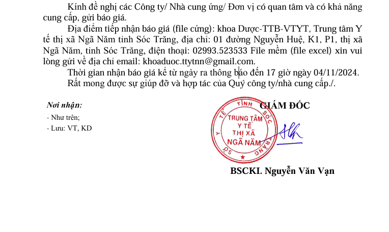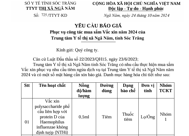 Trung tâm Y tế thị xã Ngã Năm Yêu cầu báo giá phục vụ công tác mua sắm Vắc xin năm 2024 của Trung tâm Y tế thị xã Ngã Năm, tỉnh Sóc Trăng