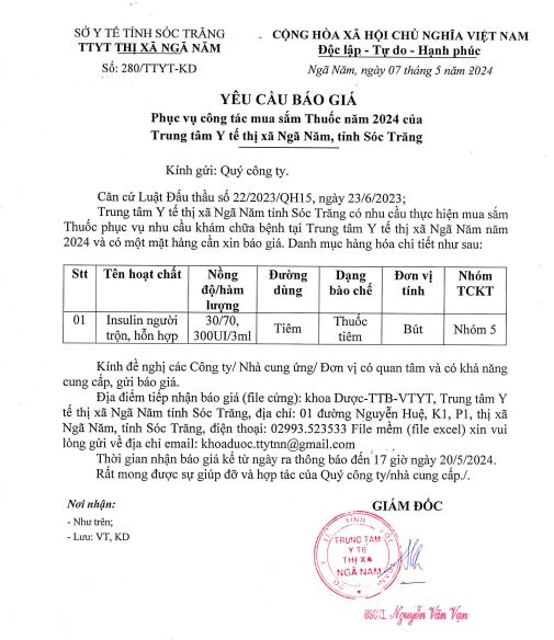 Yêu cầu báo giá phục vụ công tác mua sắm Thuốc năm 2024