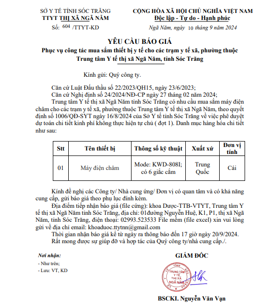 Phục vụ công tác mua sắm thiết bị y tế cho các trạm y tế xã, phường thuộc Trung tâm Y tế thị xã Ngã Năm, tỉnh Sóc Trăng