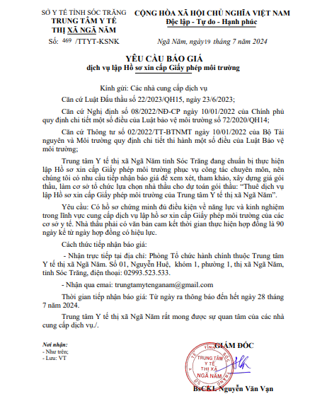 Trung tâm Y tế thị xã Ngã Năm thông báo yêu cầu báo giá dịch vụ lập Hồ sơ xin cấp Giấy phép môi trường, tải thông báo tại đây